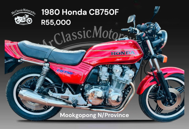 26 October, 2025 Trevor White 0 Comments 0 categories Search for: Advanced Search Browse Ads Search Ads Honda CB750F Click to enlarge image. Contact Information Contact Trevor White Phone: +27 82 448 4470 Price: R 55,000.00 More Information 🇯🇵 R55,000 🇯🇵 Pretoria Far North 1980 Honda CB750F Beautiful in red. Please click on the WhatsApp icon to connect with TrevorWhite #989845528AJ This Ad has been viewed 99 times. Related Posts Welcome to our New Site! We are excited to have our new website up and… Read More