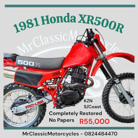 10 February, 2026 Trevor White 0 Comments 0 categories Search for: Advanced Search Browse Ads Search Ads Honda Click to enlarge image. Contact Information Contact Trevor White Phone: +27 82 448 4470 Price: R 55,000.00 More Information 🇯🇵 R55,000 🇯🇵 KZN S/Coast 1981 Honda XR500R Completely restored. Excellent condition. No papers. Please click on the WhatsApp icon to connect with TrevorWhite #786639428FH This Ad has been viewed 76 times. Related Posts Welcome to our New Site! We are excited to have our new website up and… Read More